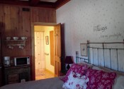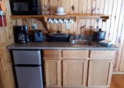 The kitchenette is housed in a Hoosier cabinet and vintage washstand outfitted with microwave, mini-refrigerator, toaster, coffee maker, small cook pot/griddle. (no kitchen sink – just like the old days, a dishpan & supplies are provided for you to wash dishes) there is a table and chairs inside and out , plus a small charcoal grill. Linens, dishes & utensils, Cable Tv and wi-fi are all provided. By virtue of being attached to the lodge it is our only cabin with air conditioning, though the big spruce trees keep it “nature cooled” as well. No pets. No Smoking.