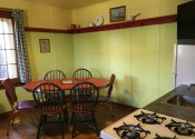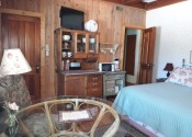 The TV is in the queen bedroom. There is also a single sofa-bed/love seat in the living room/kitchenette area. This area features gas log fireplace, a kitchenette with microwave, electric skillet, chef’s pot for boiling or slow cooking, toaster, coffee maker and under counter refrigerator. A table, four chairs, and a rocker complete the room.