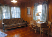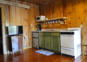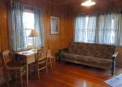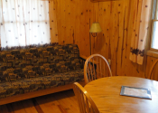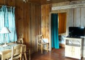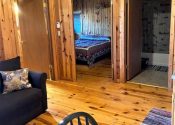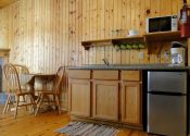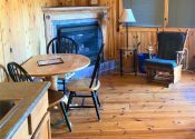 Open all year and featuring a gas log fireplace and knotty pine inside and out, each of the four cabins has its own 8×8 covered porch and separate entrance on opposite ends of the building.