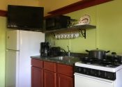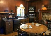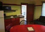 The kitchenette has an apartment sized stove with oven, toaster, microwave, coffee maker, refrigerator, sink and table chairs.