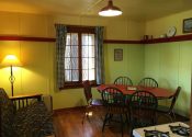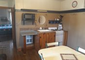 The TV is in the queen bedroom. There is also a single sofa-bed/love seat in the living room/kitchenette area. This area features gas log fireplace, a kitchenette with microwave, electric skillet, chef’s pot for boiling or slow cooking, toaster, coffee maker and under counter refrigerator. A table, four chairs, and a rocker complete the room.