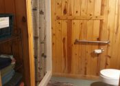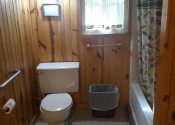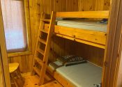 - Large Cabin #5 – 1 bedroom with 2 queens , 1 semi-private sleeping area with 2 singles, 1 bathroom with tub/shower , 2nd bathroom with 48″ shower