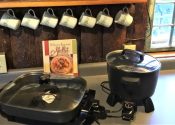 The TV is in the queen bedroom. There is also a single sofa-bed/love seat in the living room/kitchenette area. This area features gas log fireplace, a kitchenette with microwave, electric skillet, chef’s pot for boiling or slow cooking, toaster, coffee maker and under counter refrigerator. A table, chairs, and a rocker complete the room.
