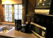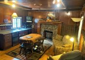 There is also a love seat in the living room/kitchenette area. This area features gas log fireplace, a kitchenette with microwave, electric skillet, chef’s pot for boiling or slow cooking, toaster, coffee maker and under counter refrigerator. A table, chairs, and a rocker complete the room.