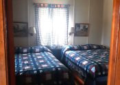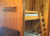 There is a queen size bed in one bedroom and small second bedroom with built in twin size bunkbeds. The 8 foot walls are open at the top and share the vaulted ceiling for a spacious feeling and good air flow. Of course each of the duplex units is totally separated from the other with a full wall between them.