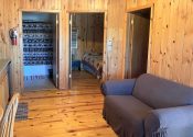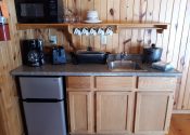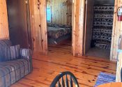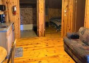 The main cabin is one large room with the sleeping area divided from the kitchenette/living area by two log-type bookcases. The kitchenette has a microwave, electric skillet, chef’s pot for boiling or slow cooking, toaster, coffee maker and 2 under counter refrigerators. The tv is in the kitchenette/living area of this unit which also has a love seat and recliner. The attached bedroom has its own bathroom with tub & shower and 2 queen size beds.